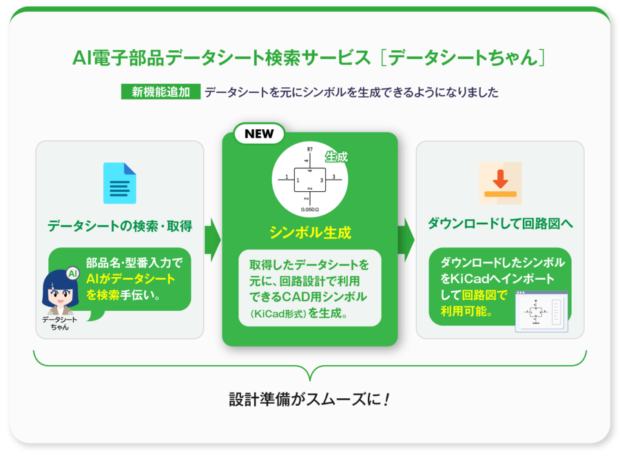プリント基板のネット通販「P板.com」を運営する株式会社ピーバンドットコム(東証スタンダード・名証メイン 3559、以下当社)は、AI電子部品データシート探索サービス「データシートちゃん」において、取得したデータシートをもとに基板設計用CAD用シンボル(KiCAD形式)を生成し、ダウンロードできる機能を追加しました。これにより、部品情報の探索から回路設計の準備までをよりスムーズに行えるようになりました。