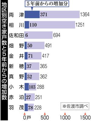 空き家は記録の残る10年度の2330戸から増加の一途をたどっている。25年度は両津、相川は空き家の数が多く、それぞれ1364戸、1251戸だった。