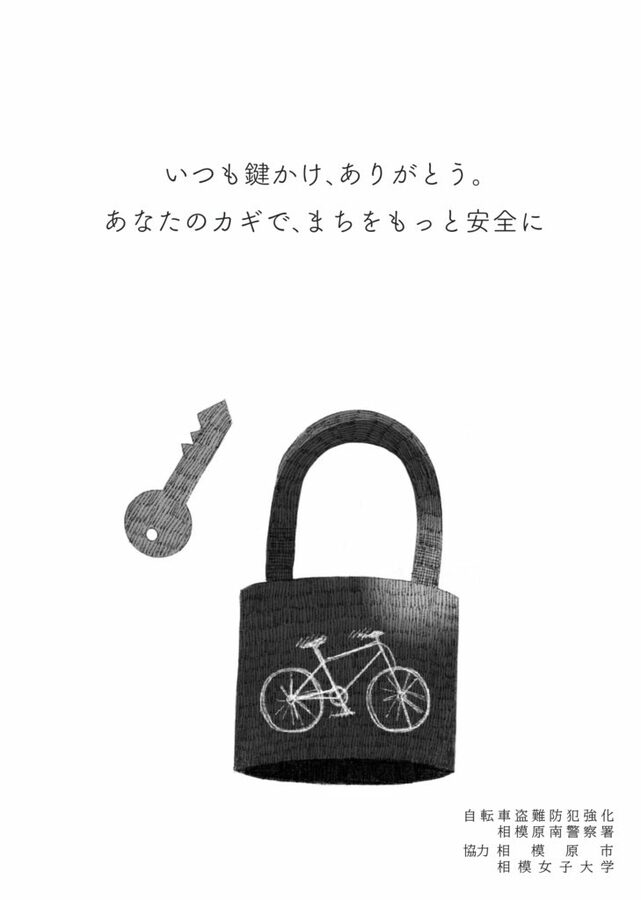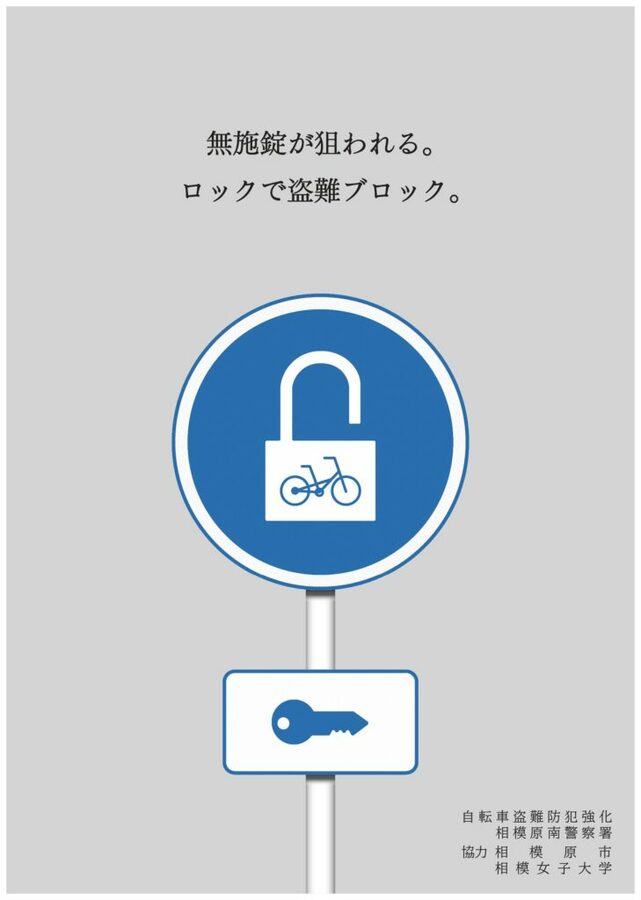 相模原南警察署管内では、自転車盗難件数が急増しており、その約半数が無施錠によるものです。多発する自転車の盗難を防止するため、相模原南警察から依頼を受け、本学人間社会学部人間心理学科の芝田征司教授が、ナッジ理論(※)という心理学的知見を生かし、施錠行動を促すメッセージを3種類考案しました。あわせて、本学学芸学部生活デザイン学科堀内恭司教授指導の下、学生がそれぞれのメッセージを効果的に伝えるポスターデザインを制作しました。