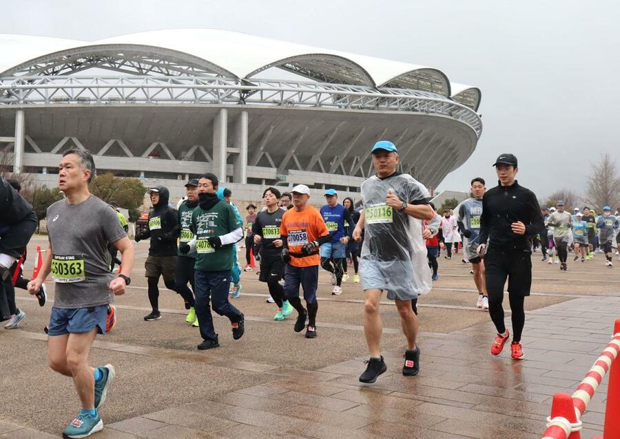 早春の新潟市内の田園地帯を駆ける恒例の新潟ハーフマラソン(新潟陸上競技協会主催)が15日、中央区のデンカビッグスワンスタジアムを発着点に行われた。県内外から参加した約4千人が、降りしきる小雨をものともせず力走した。