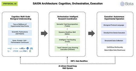 認知層は、Botaの「Cell2Cloudバイオファウンドリ」(Cell2Cloud Biofoundry)のデータに基づいて構築されており、数千万もの実験データポイント、数百万もの科学出版物や特許、そして公開生物学的データベースを統合しています。最先端の「AI4Science」モデルと組み合わせることで、SAION AIは遺伝子-タンパク質-細胞-発酵の連続体全体にわたるマルチスケールの理解を発展させ、体系的な設計とデータ駆動型の科学的決定を可能にします。