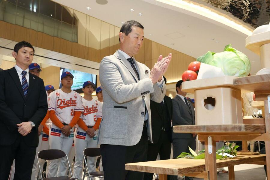 一般公開で行う「出陣式」の形式は、球団初の試み。式には池田拓史球団社長や武田勝監督ら約50人が出席して必勝祈願を行い、約400人のファンが見守った。