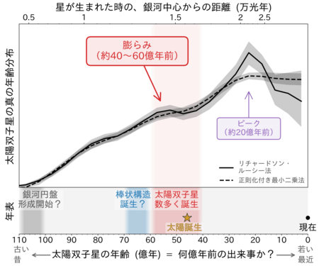図4:(上)2種類の手法で観測データの偏りを除去して得た、太陽双子星の真の年齢分布。(下)棒状構造の形成によって、太陽系と多数の太陽双子星が誕生し、現在の太陽系の位置まで誕生後すぐに移動したのではないか、と提案した。太陽双子星は年齢と誕生半径に逆相関があると考えられてあり、その目安を上軸に示した。
