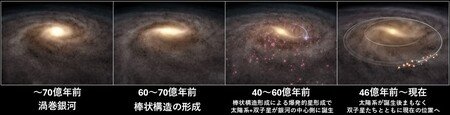研究グループは、この大移動の引き金として、棒状構造の形成期に注目しました。形成後の安定した棒状構造は共回転バリアにより大移動を難しくします。逆に、形成時期には、その力学的影響によって中心部で星形成が活発化し、同時に星が効率的に動径方向移動できる可能性が先行研究で指摘されています。もし、天の川銀河の棒状構造が約60~70億年前に形成されたとするなら、その形成に伴い、約40~60億年前に太陽系と多数の太陽双子星が銀河の中心側で誕生し、誕生後まもなく現在の位置まで大移動できた可能性があります(図1;図4下)。棒状構造の形成時期は長年議論され、80億年以上前とする説が主流でした。しかし本研究のシナリオは、その時期が約60~70億年前であった可能性を新たに指摘する点でも意義があります。