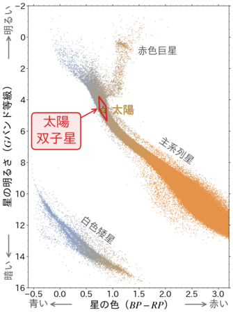 研究グループが鍵として注目したのは、太陽にそっくりな星たち、「太陽双子星[1]」です。太陽双子星は、色や明るさなどが太陽と非常に近く(図3左)、個々の性質や、さらには統計的性質を、非常に高い精度と信頼度で調べることができる、珍しいタイプの恒星です。しかし、従来研究ではサンプルサイズや年齢決定の信頼性が十分でなく、統計的な研究に踏み込むことが難しい状況でした。