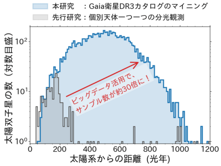 (右上) 本研究で得た太陽双子星たちの距離ヒストグラム(青)。個々の恒星を分光した先行研究(黒)と比べ、約30倍ものサイズのサンプル構築に成功した。