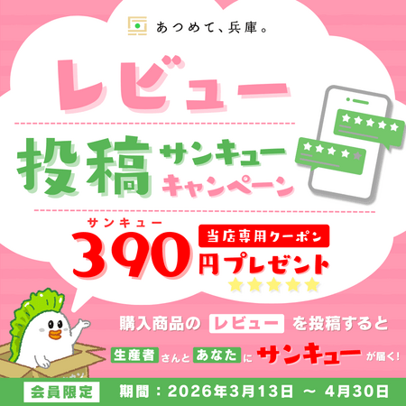 JA全農兵庫が運営する、産地直送通販サイト「JAタウン」内のショップ「あつめて、兵庫。」では、2026年3月13日~4月30日の期間中、当ショップでご購入の税込1,950円以上の商品についてレビュー投稿いただいた会員様に、390円クーポンをプレゼントいたします。