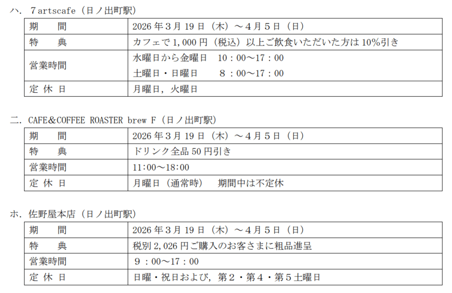 また,3月28日(土)・29日(日)には,日ノ出町駅~黄金町駅間高架下で開催の「はつこひ市場 桜とコーヒー」,「のきさきアートフェア」や,3月28日(土)にオープンする南太田駅前広場「ひといきスペースDONDON」でマルシェ等を同時開催することで,大岡川沿いの各地区で開催されるイベントとの連携を図ります。大岡川の桜に沿って,スタンプラリーを楽しみながら広域を回遊していただく体験の創出を目指します。