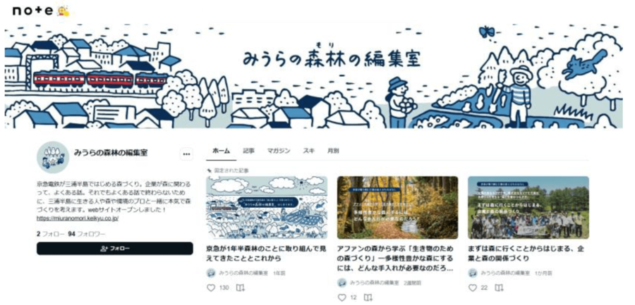 企業が森に関わるって,よくある話。でも「よくある話」で終わらないために,三浦半島に生きる人や森や環境のプロと一緒に本気で森づくりを考えるため,京急電鉄が三浦半島ではじめる森づくりの過程をまっすぐにお届けするnote「みうらの森林(もり)の編集室」を開設しています。