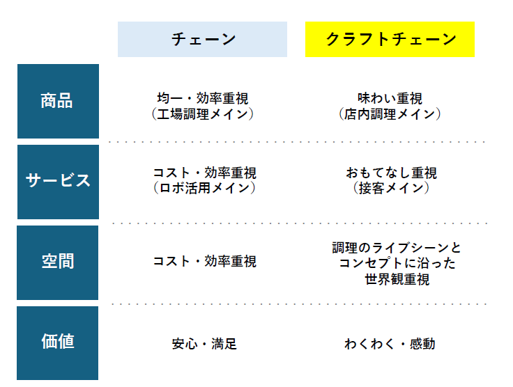 ・効率を重視する一般的なチェーン店は、工場調理(セントラルキッチン)をメインとするのに対し、クラフトレストランは店内で調理することを重視しています。
