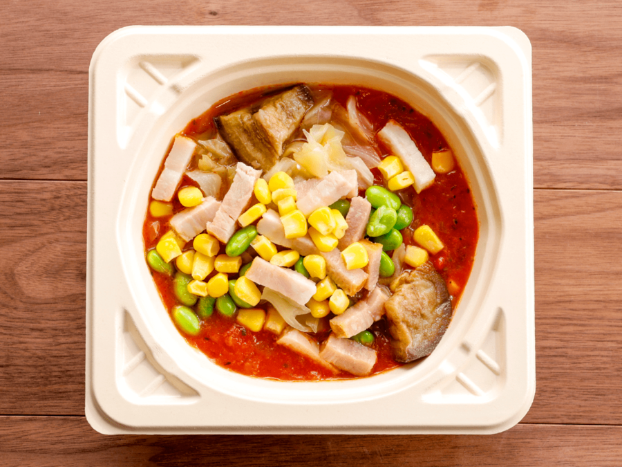 トマトの濃厚な旨みをベースに、隠し味にコンソメとベーコンを加え、酸味の角を取ってまろやかに仕上げました。レンジで温めた瞬間に広がるバジルの爽やかな香りは格別です。茄子や枝豆、ベーコンなど食感の異なる7種の具材をたっぷり詰め込み、最後の一滴まで飽きることなく楽しめる一杯です。