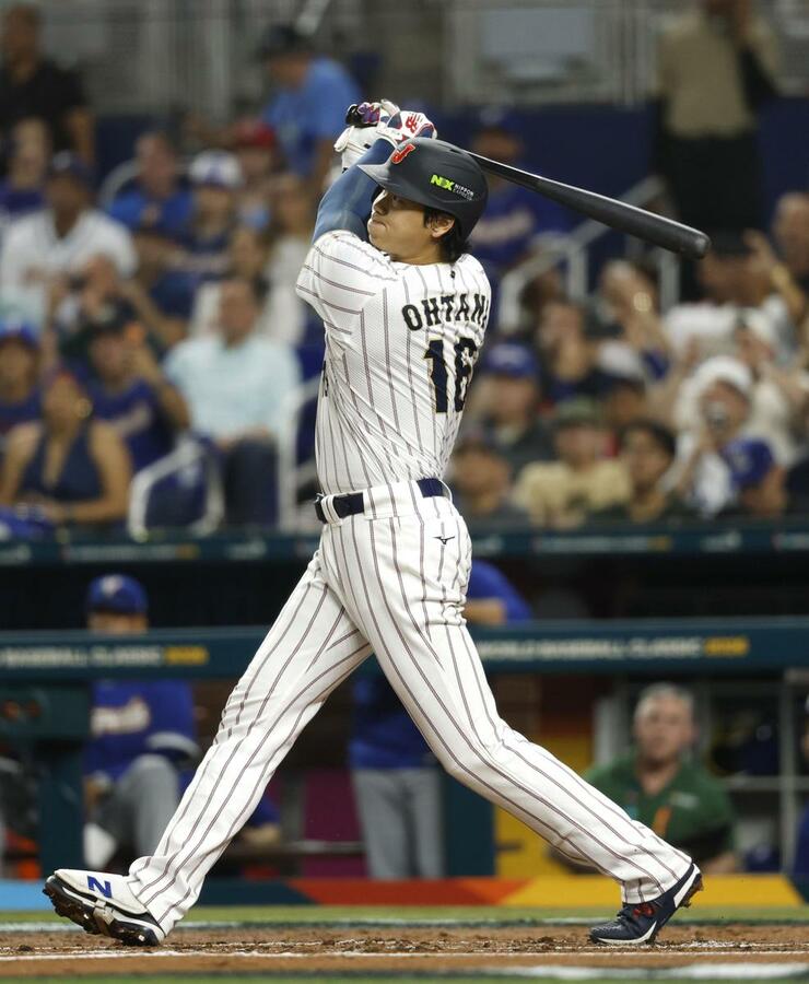 1回日本、大谷が右中間に先頭打者本塁打を放つ=マイアミ(共同)