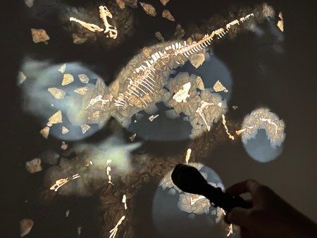 懐中電灯型のデバイスをスクリーンにかざすことで、恐竜化石の発掘を体験