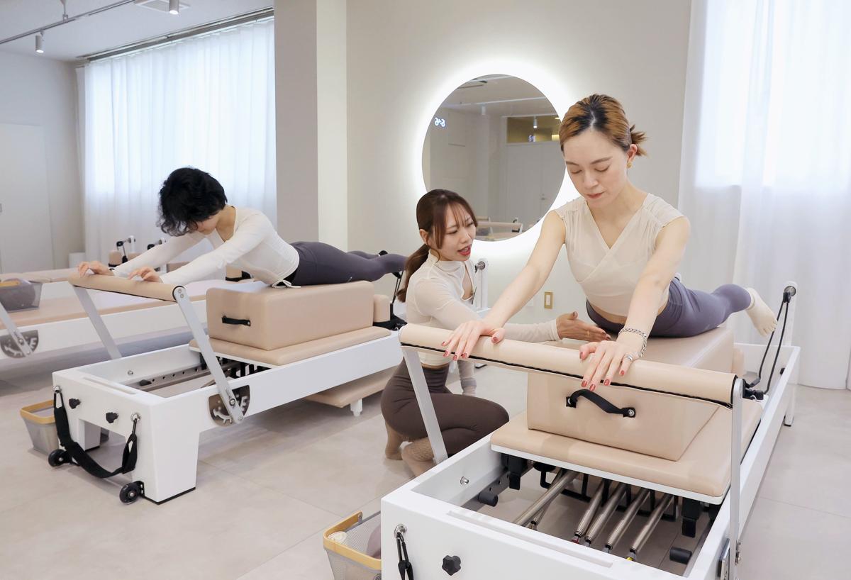 シックで韓国風の雰囲気が漂うおしゃれなスタジオに、専用マシン「リフォーマー」がずらりと並ぶ。今年1月に新潟市東区にオープンした女性専用のスタジオ「ONDPILATES the niigata」ではインストラクターの指導を受けながら、女性らがマシンを使ってトレーニングに励んでいた。