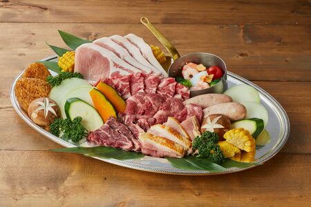 牛タン、国産牛ロース、牛ハラミ、国産霧島三元豚ロース、国産阿波鶏モモ肉、ジャンボソーセージ、イカとエビのアヒージョ、焼きおにぎり、野菜5種