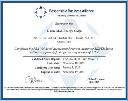 台北、2026年3月16日 /PRNewswire/ -- Molicelは、自社工場がResponsible Business Alliance(RBA)より正式にシルバーステータスを授与されたことを発表できることを誇りに思います。この名誉ある認定は、グローバルな持続可能性および倫理的サプライチェーンのリーダーシップを目指すMolicelの歩みにおける重要なマイルストーンとなります。