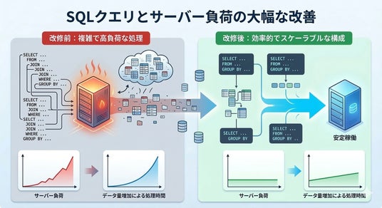 今回の改修では、データ集計の中核を担うデータベースへの問い合わせ処理(SQL)を根本から再設計しました。従来の処理では、複数のデータを段階的に結合・集計する構成がサーバーへの負荷を高めていました。今回、処理の流れを一から分析し、必要なデータのみを効率的に取得する構成へと刷新。データ量が増加しても処理時間が大きく膨らまない、スケーラビリティの高い設計を実現しています。
