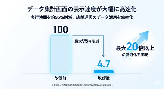 今回の改修により、データ集計画面の表示速度を最大20倍以上に高速化(実行時間を約95%削減)。店舗運営の現場におけるデータ活用のさらなる効率化を支援してまいります。