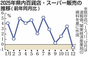 関東経済産業局が発表した2025年の県内百貨店・スーパー販売動向(速報)によると、県内の百貨店スーパーの合計販売額は、新店を含まない既存店ベースで前年比2・8%増の4482億円だった。年間を通じて、物価高騰の影響で、衣料品などは振るわなかったものの、必需品である飲食料品の伸びが全体を引き上げた。