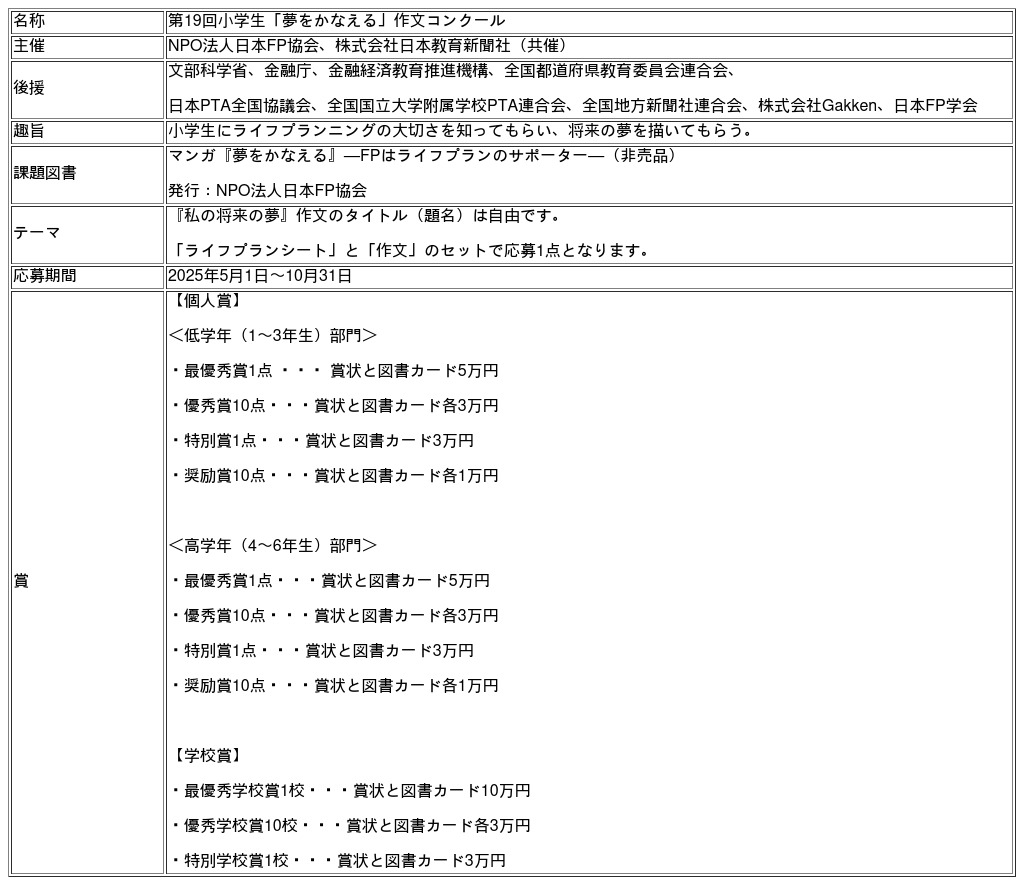 日本FP協会(所在地 東京都港区、理事長 白根壽晴)は、第19回「小学生『夢をかなえる』作文コンクール」の入賞者を決定しました。本コンクールは、全国の小学生に将来の夢を描いてもらい、その夢を実現するためのライフプランの考え方や大切さを知ってもらうことを目的として毎年開催しています。