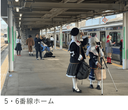 5 ・ 6 番線ホームおよび 5 番線に停車中の E501 系と 6 番線に停車するキハ 110 系の車内にて撮影や、ムコナくんとの記念撮影をお楽しみいただきます。