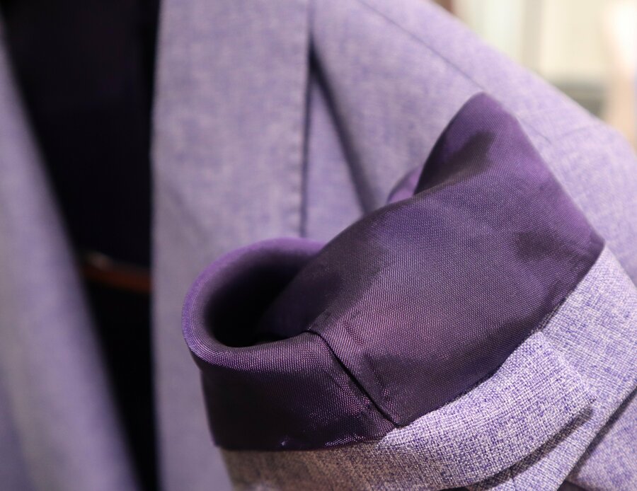 今回新たに追加した生地は、ピンク・オレンジ・エメラルドグリーン・ライムグリーン・パープル・ブルー・バイオレットグレー・ライトブルーの全8種類です。淡い色味や白い糸を織り交ぜ、上品で肌馴染みの良い色に仕上げることで、ビジネスシーンでも取り入れやすくしました。さらにこれらの表地に合わせて同系色の裏地も用意しており、表地で鮮やかな色に挑戦できない方でも、裏地でさりげなく推し色を取り入れることもできます。大事な場面での勝負服としてだけでなく、日常的にも推し色を身にまとうことで、働くモチベーションの後押しにつながる企画です。