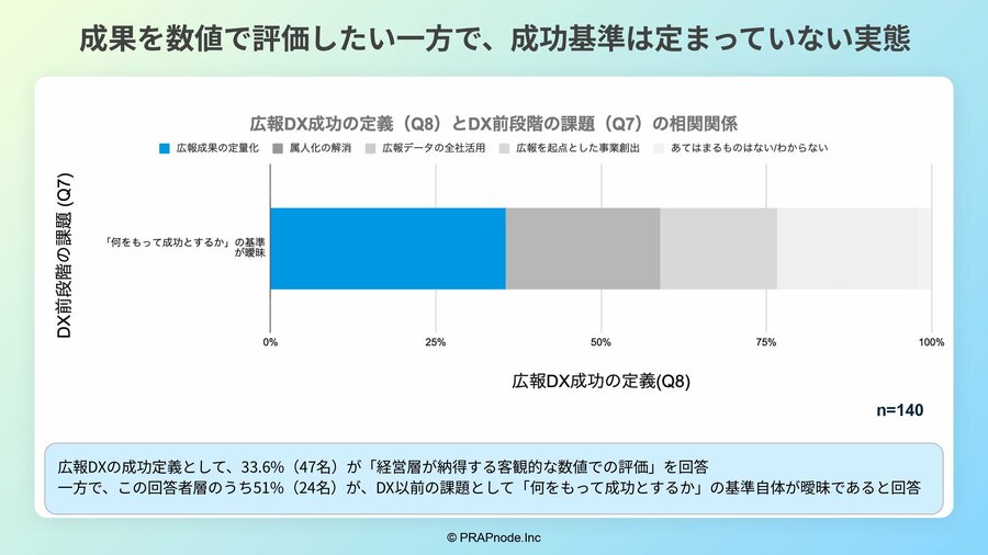 広報DXの成功定義として、33.6%(47名)が「経営層が納得する客観的な数値での評価」を挙げています。一方で、この回答者層のうち51%(24名)が、DX以前の課題として「何をもって成功とするか」の基準自体が曖昧であると回答しました。
