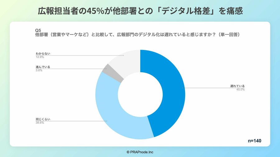 また、広報担当者の45%が「他部署に比べて自部署のDXが遅れている」と回答。部門間でDXの進み具合に差があることが、広報現場の課題感につながっていると考えられます。
