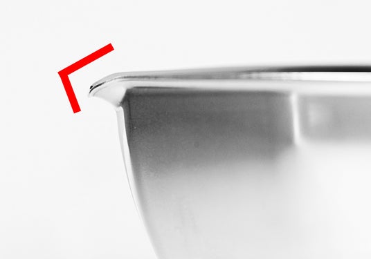キレの良さの秘密は、注ぎ口を2段階に折り曲げた独自形状。液体がボウル内へ戻りやすい形状で、注ぎ口に液が残りにくく、液だれを防止。さらに、しずく型の底面が液体を注ぎ口へ集め、一気に流れ出るのを防ぎながらスムーズに注げます。本製品は丈夫でサビに強いステンレス製。この特殊形状をステンレスで成形するには高度な加工技術が必要で、燕三条の職人の技術によって実現しています。