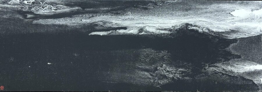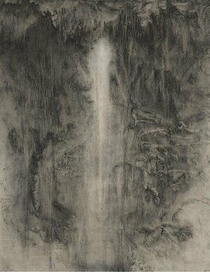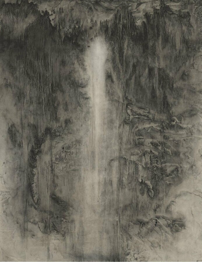 私が使用する《古墨》は、何十年・何百年もの歳月が経っている。長い時間を固形の《墨》という形の中に押し込められていた《煤》に、清らかな水を与え、硯でほぐすことで、長い眠りから目覚めさせ、現代に解き放つ。その粒子を、水と共に筆で吸い上げ、紙の上に走らせる。水の中に分散している墨の粒子は、画中で踊り、揺らぎ、ゆっくりと沈む。やがて水が引き、粒子が紙の上に『現象』を浮かび上がらせるのだ。そこには、墨が経た時間をも内包している。
