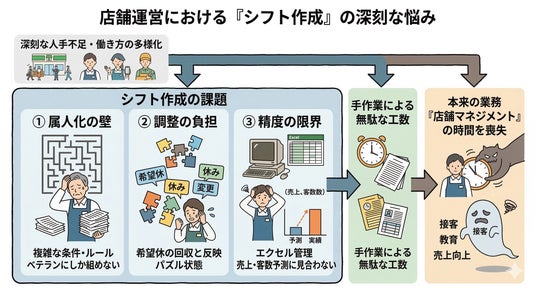 今回の展示会で、シフト作成に課題を抱える多くの企業様とお話しする中で、現場のリアルな悩みが改めて浮き彫りになりました。特に多かったのは、「店長しかシフトを作れない」という深刻な属人化の問題です。さらに、店舗間や企業内で統一されたシフト作成ルールがなく、担当者の経験や勘に依存してしまっているという現状が多く見受けられました。 昨今の人手不足を背景に、シフト作成業務の負担軽減と標準化は、多くの企業にとって今すぐ解決すべき急務となっています。