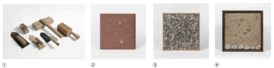 写真①三和土をつくる道具類(左から/金鏝、ブラシ、木鏝、たたき鏝、たたき棒※、木槌)所蔵:川口正樹、 久住有生(※)②土間床見本「かき落としスポンジ拭き取り」制作・所蔵:久住有生/300×302×H30mm ③土間床見本「あられこぼし」制作・所蔵:西川和也/425×425×H45mm ④土間床見本「土佐漆喰たたき」制作・所蔵:松木憲司/450×450×H100mm 撮影すべて:ToLoLo studio