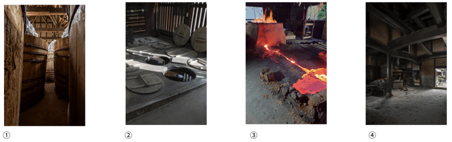 写真①まるや八丁味噌「味噌蔵」(主に温度保持、耐荷重性) ②郡上本染 渡辺染物店「甕場」(主に蓄熱性・耐水性) ③たなべたたらの里「たたら吹き」の作業場(主に耐火性・耐荷重性)/写真提供:たなべたたらの里 ④重要文化財 旧内田家住宅(南知多町)の「主屋にわ(土間)」(主に耐汚性・耐水性) 特記以外撮影:ToLoLo studio