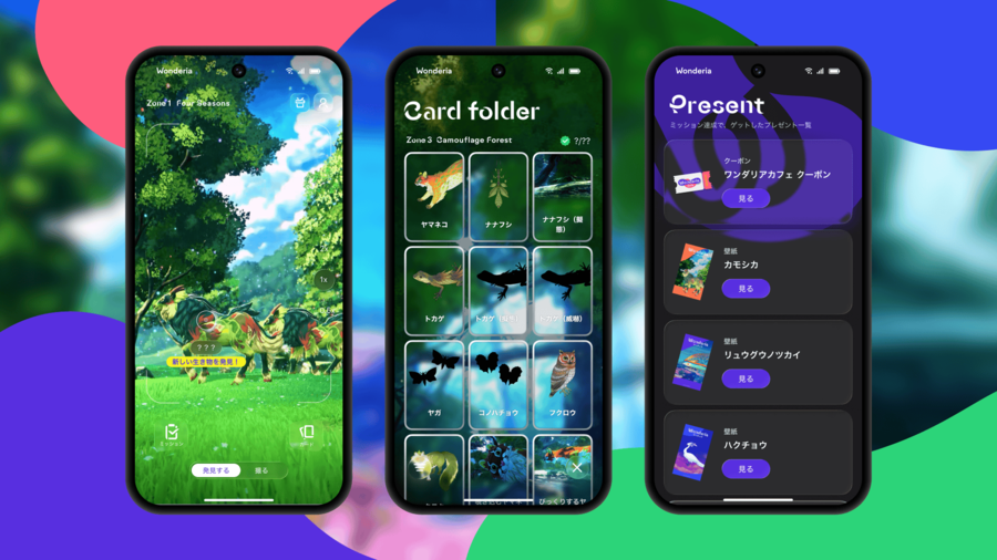 体験を深化させ、生き物への興味を育む:施設公式アプリ「ワンダリアアプリ」を起動し、スマートフォンを映像にかざすと、生き物をリアルタイムで読み取れます。多様な生き物とのつながりや、学びのきっかけにふれられるほか、発見した生き物はカードとして収集できます。カードには本施設のために書き起こされた「ワンダリアチップス」が記載され、生き物にまつわる知識を学べます。