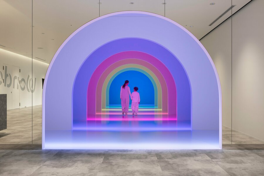 ワームホールのように光と音の演出で非日常へと誘うエントランス。施設ロゴのカラーを用いた色彩豊かで多層的なゲート演出が、「ワンダリア横浜」の世界観へと導きます。