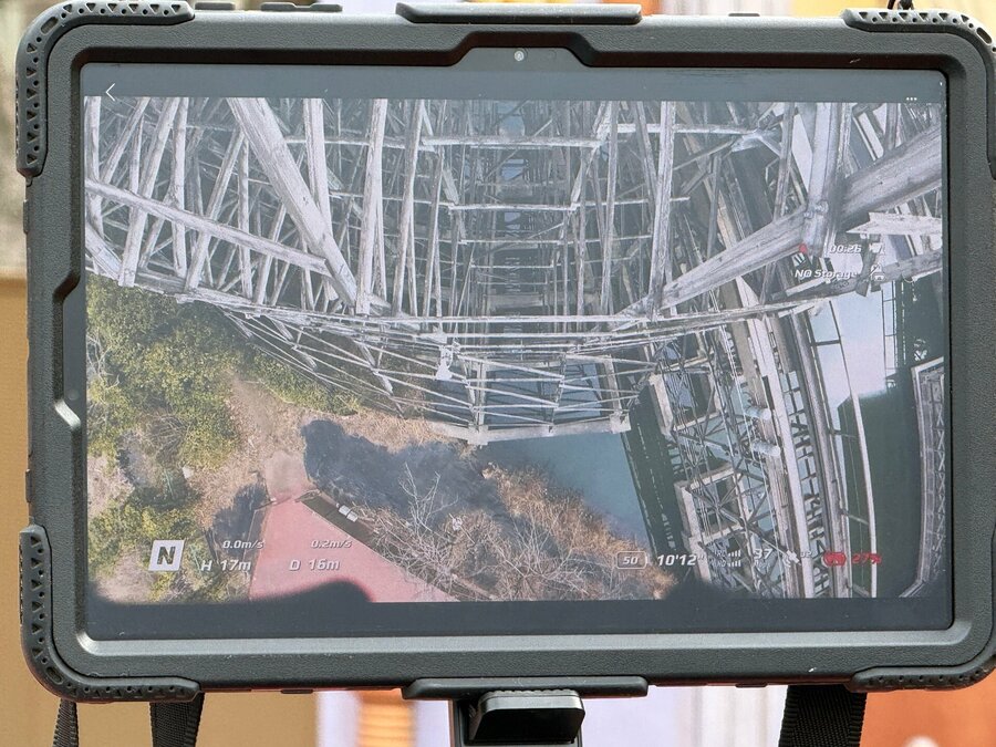 モニターには操縦者の視点映像が表示され、点検箇所を確認するとともに、確認者が飛行中のドローンを目視で監視し、風の影響や周囲の状況を操縦者へ伝達することで、安全に配慮した点検を行いました。