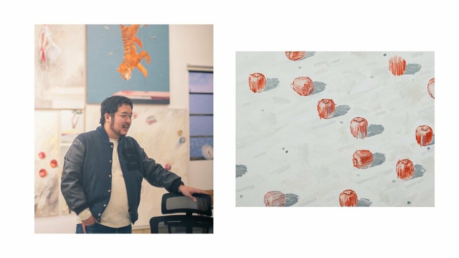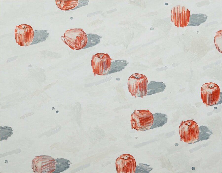 ▲小津航《Apples on the Ground-The Big Dipper-》1203×946×48mm, Oil on canvaswooden frame,2026年(作家撮影:西中拓史)