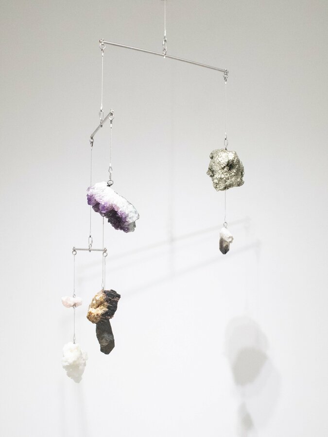 ▲表良樹《Floating minerals #1》size variable(referential size:1250×800×200mm),mineral, stainless steel, stainless wire,2024年
