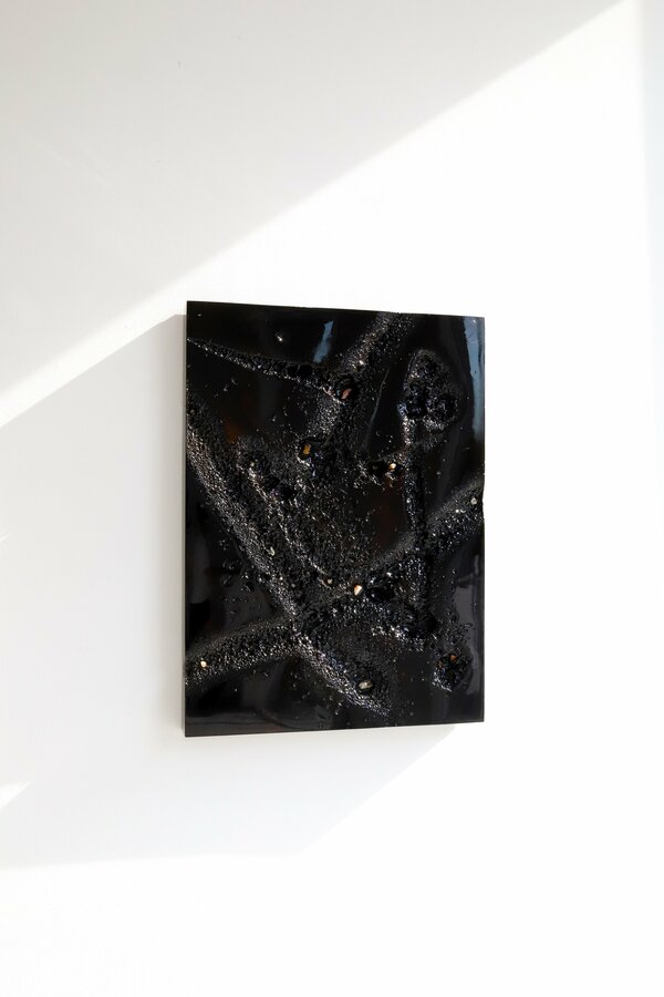 表良樹《Steak #3》635×450×50mm(壁掛け設置), mineral, stainless steel, stainless wire size variable, 2024年