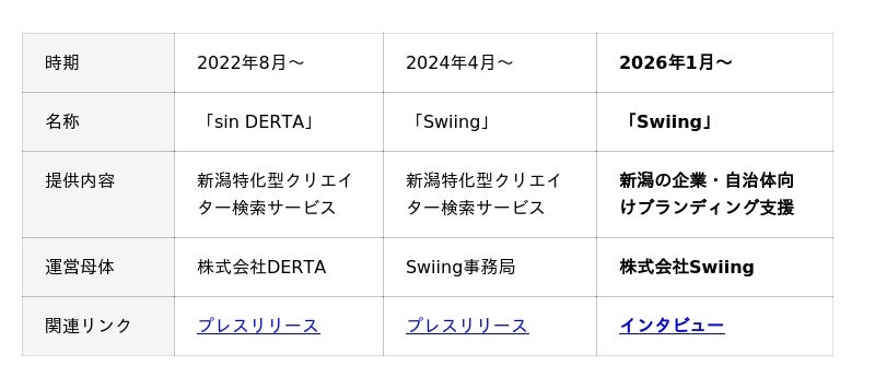 株式会社Swiing(本社:新潟県新潟市、代表取締役:嘉藤宏樹、以下Swiing)は、2026年1月に法人化し、新潟企業向けのブランディング支援サービスを開始したことをお知らせします。Swiingは、デザイナー、コピーライター、エンジニアなど多様な専門性を持つ新潟の制作会社・フリーランス等がプロジェクトごとにチームを編成し、新潟の企業・自治体の課題整理からクリエイティブ制作までを一気通貫で支援します。