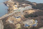 再整備に向けた動きがあった「風の丘米山」周辺。奥にある国道側に商業施設やホテルが並ぶ=柏崎市青海川(本社小型無人機から)