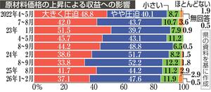 原材料の仕入れ価格上昇による収益への影響について「大きく圧迫」と回答した割合は、前回を4・6ポイント下回る37・1%だった=グラフ参照=。「やや圧迫」は3・4...