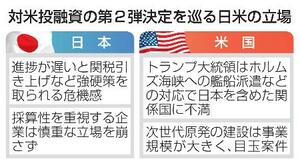次世代原発の建設など計11兆円を超える巨額の対米投融資の第2弾が決まった。日本政府は、ホルムズ海峡への艦船派遣などの対応で日本を含めた関係国に不満を強めるトランプ米大統領の関心を引こうと、経済面の成果の具体化に躍起となった。ただ、事業に参画する日本企業は採算性を重視しており、政府との温度差が目立っている。