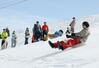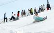 わら製のそり「ぼぼぞり」で滑るタイムを競った催し=20日、長岡市の古志高原スキー場