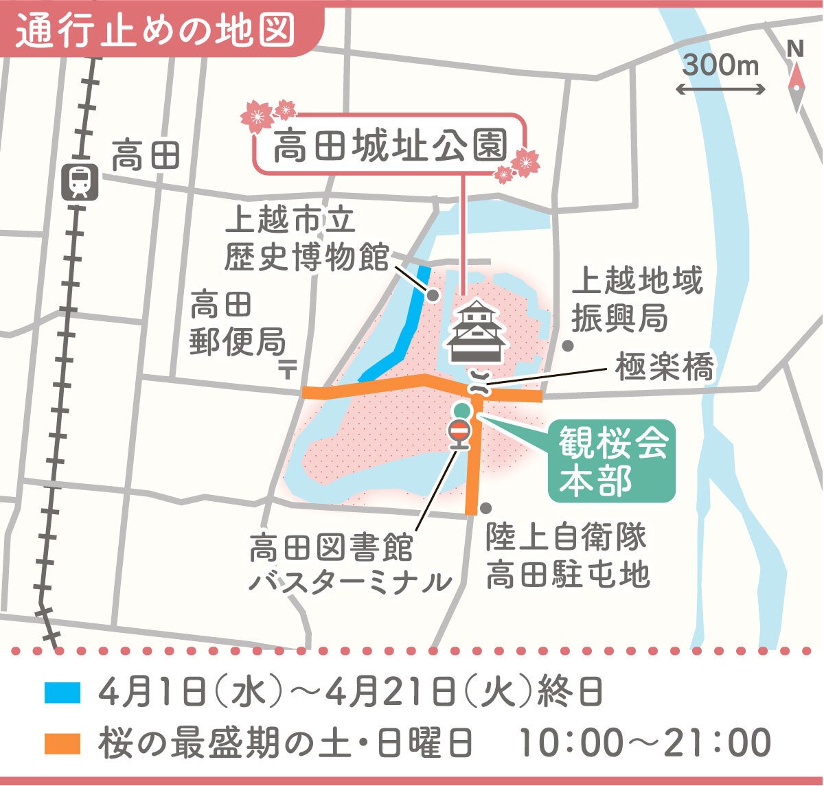 | 桜の最盛期の土・日 | 10:00~21:00 | ・高田郵便局~上越地域振興局 ・極楽橋~陸上自衛隊高田駐屯地 |