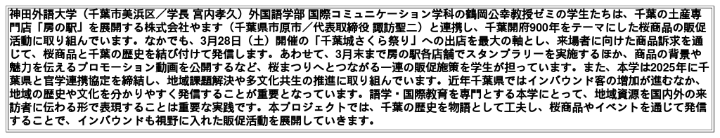 千葉開府900年に向けて活気づく中、この大きな節目を神田外語大学の皆様と共に盛り上げられることを大変嬉しく思います。学生たちが考案したスタンプラリーやプロモーション動画、そして「千葉城さくら祭り」での体験型販促を通じて、千葉の歴史と桜商品の魅力がより広く、深く伝わることを願っております。
