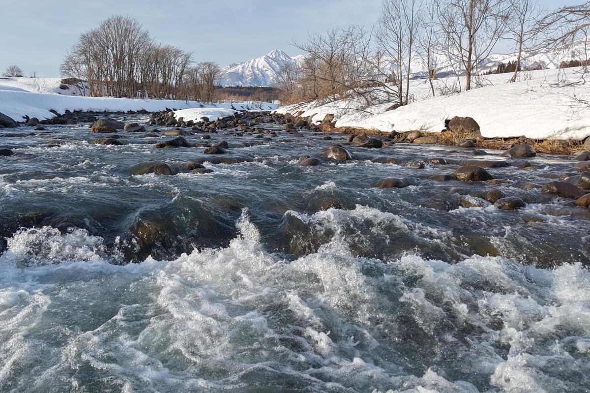 川底に積み重なるごろごろとした岩の間を、雪解け水は勢いよく流れていく。所々でしぶきが上がる。見上げれば白く輝く妙高山。辺りには春の気配が漂うが、矢代川の水は刺すように冷たい。