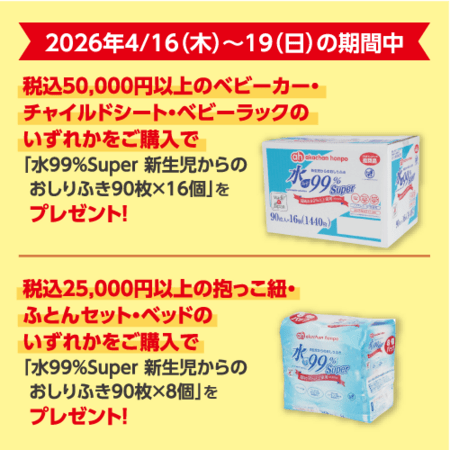 さらに期間中、税込50,000円以上のベビーカー・チャイルドシート・ベビーラックのいずれかをご購入の方へ「水99%Super 新生児からのおしりふき 90枚×16個」を、税込25,000円以上の抱っこ紐・ふとんセット・ベッドのいずれかをご購入の方へ「水99%Super 新生児からのおしりふき 90枚×8個」をプレゼントいたします。