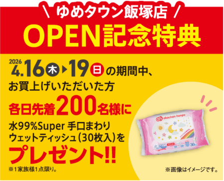 株式会社赤ちゃん本舗(本社:大阪市中央区 https://www.akachan.jp)は、福岡県飯塚市の商業施設 「ゆめタウン飯塚」内に、『アカチャンホンポ ゆめタウン飯塚店』を 2026年4月16日(木)に オープンいたします。また、オープンを記念いたしまして期間限定セールやポイントアップ企画などを実施いたします。