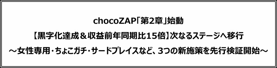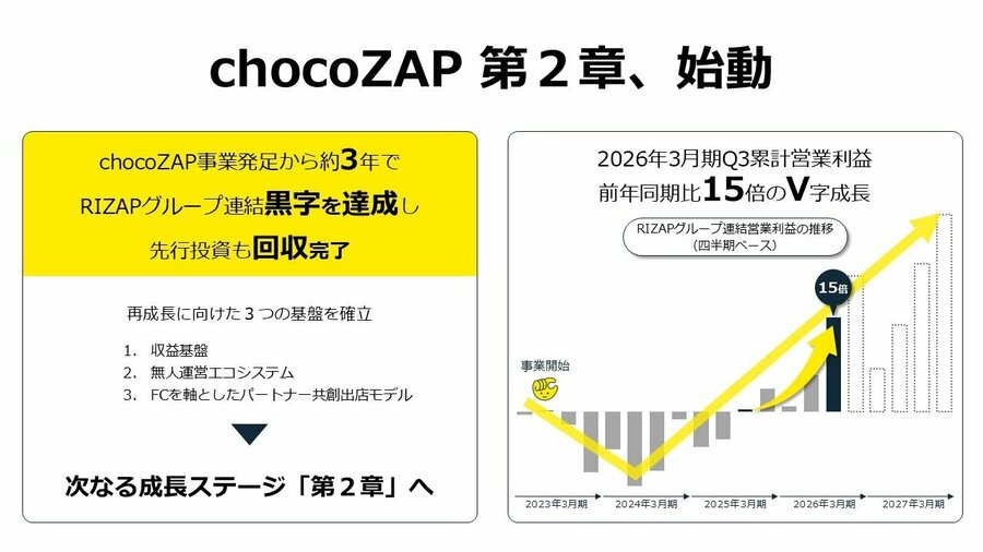これまでchocoZAPは、フィットネスの心理的・物理的ハードルを下げる「第1章:発足と拡大」に邁進してまいりました。この度、先行投資の回収完了とともに、独自の「無人運営エコシステム」や「FC共創モデル」による強固な収益基盤を確立したことを受け、次なる成長ステージである「第2章」へと移行いたします。